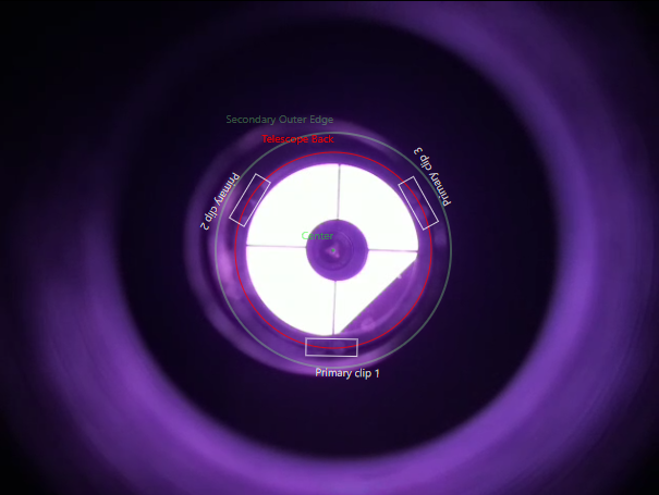 If you look closely at the left image, you can see faint black circle sourounding triangle on the primarry mirror reflection. That's our eyepiece camera lense. And that should be centered with primery mirror reflection.